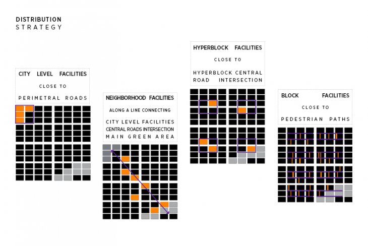 Hyperblock level facilities are located in the central part of each hyperblock, close to its main roads intersection. Finally, block level facilities are distributed through the neighborhood, in the ground floor of residential buildings and close to pedestrian paths.