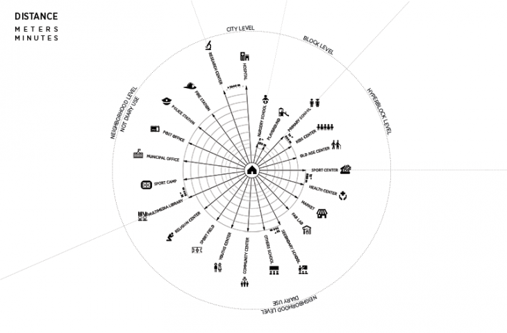 Each facility has a different radius of influence, according to its scale of service. The distance from each point of the neighborhood to the different facilities is expressed in meters or minutes walking. Facilities with the smallest radius of influence are nursery school and playground (250 m – 5 min), from 500 to 600 meters distance (10 minutes walking) have to be located facilities at hyperblock level (primary school, kids center, old age center) and the rest of facilities possess a radius of influence between 600 and 800 meters (12-16 minutes). Neighborhood level facilities are divided in two groups: diary use facilities, from 600 to 700 meters distance (e.g., market, secondary school, religious center) and not diary use facilities, between 700 and 800 meters (e.g., sport camp, municipal office, police station). Finally, city level facilities can be located at more than 1.000 m distance from each point of the neighborhood, as they serve the whole city.