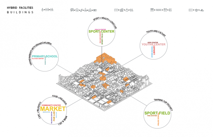 Mix-use facility buildings are distributed along main roads in the neighborhood and close to the central intersection. This central place is the main civic space in the neighborhood, where are located some of the most important community facilities: market, fab lab, religious center, municipal and postal office, community center, multimedia library, kids, youths and old age center, sport and health center.