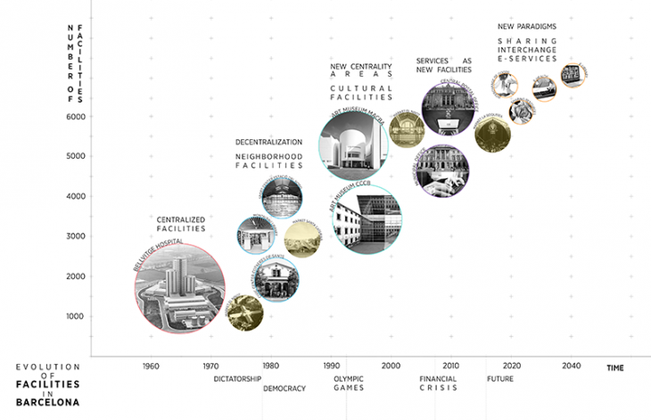 In the last fifty decades, facilities in Barcelona passed through different phases. From the centralized facilities during the dictatorship, to the decentralization of facilities in the eighties, coinciding with the democracy. The aim of the new municipalities was to give to each neighborhood some facilities at neighborhood level, like libraries, sport centers, cultural centers and, very characteristic of this period, civic centers, as places of participation.