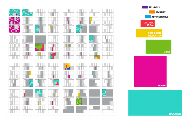 The proposal for facilities in the case-study neighborhood includes traditional categories: educational, social and cultural, sport, health, commercial and production, administrative, security and religious facilities.