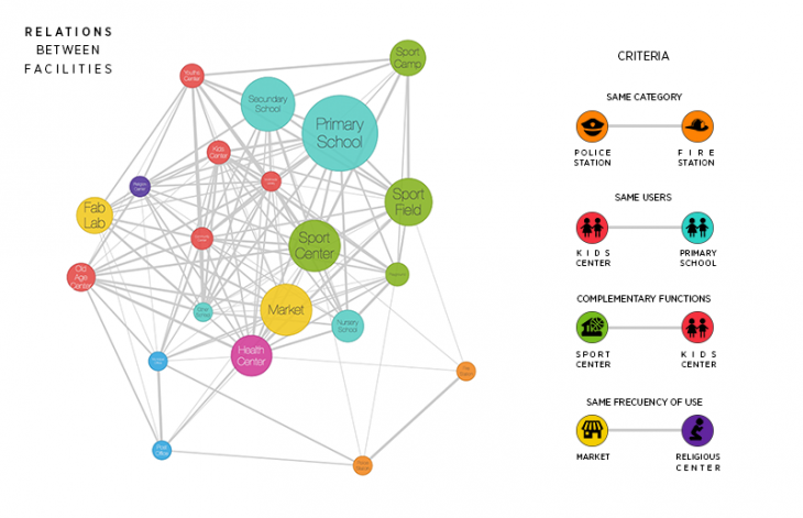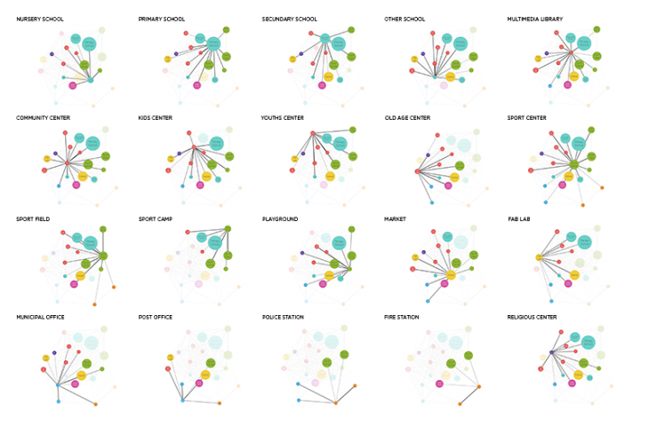 In the general graph about relations between facilities the level of connection is expressed by the thickness of the line that join two facilities. The color of the circle of each facility indicates the category of the service and the size of the circle symbolizes the area of the facility.