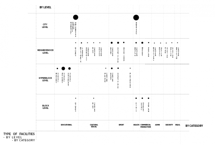 In the self sufficient neighborhood facilities are divided in four level: city, neighborhood, hyperblock and block level. An hospital and an university biomedical research center are the two facilities at city level. Most of the facilities are at neighborhood level, generally located in one center that serve all the neighborhood, but in some cases are distributed also in other levels. Facilities at hyperblock level are basically educative and sport facilities. At block level are located the facilities that serve only some blocks in the neighborhood.