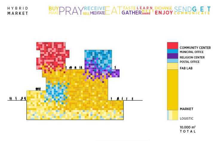 The main market in the neighborhood shares building with another commercial facility, fab lab. Religious center is also close to the market, because of the relation between food and religion. Other civic functions are placed together with religious and commercial facilities: community center, municipal and postal office.