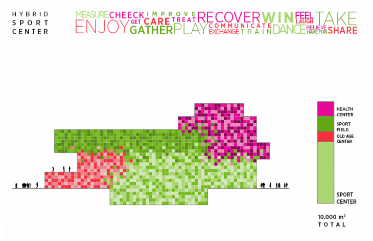 The third hybrid building located near to the center of the neighborhood join sport and health facilities: an health center share building with an old age center, a sport center and sport fields. The building is placed beside the sport camp of the neighborhood.