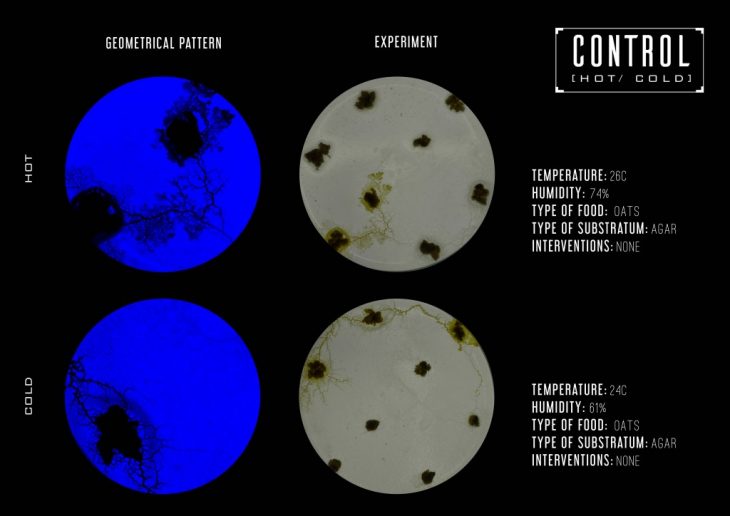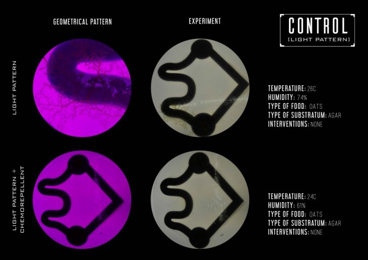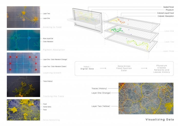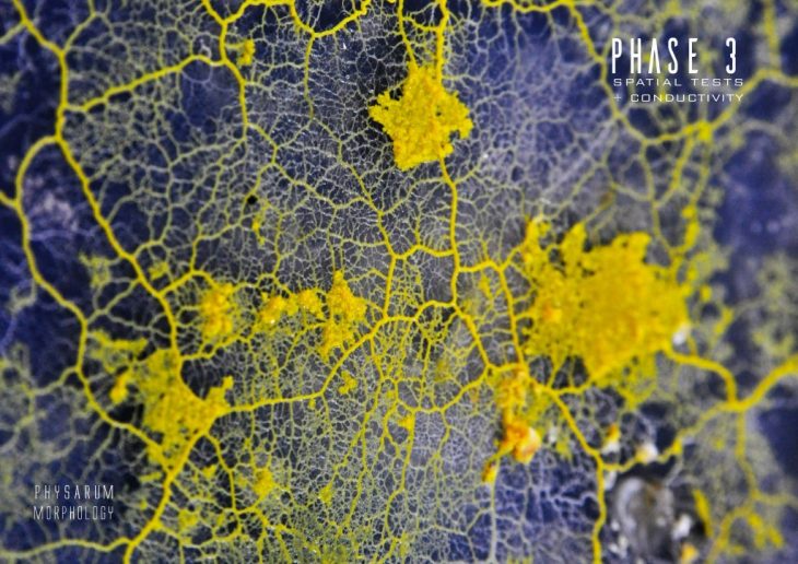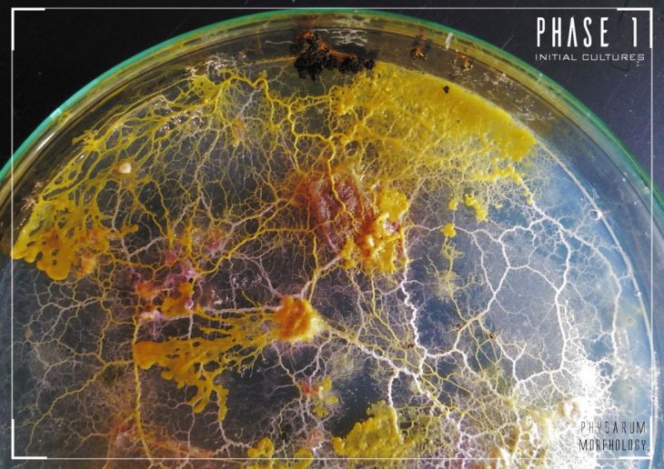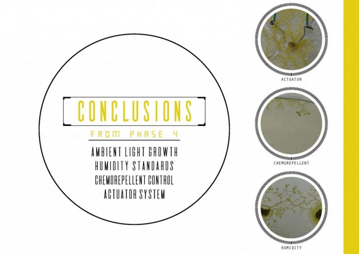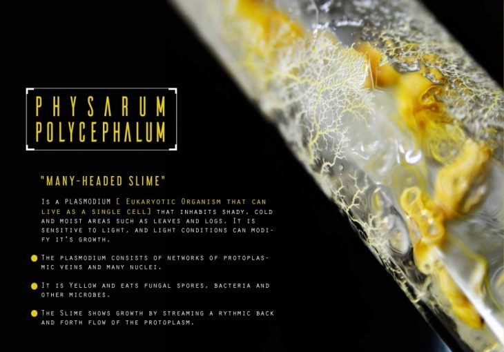 Physarum Polycephalum, also known as slime mould, is a bright yellow, visible, single-celled organism that multiplies with its thousands of nuclei, and fans out in search of nutrients. Though it lacks a brain and nervous system, this organism demonstrates spatial intelligence, finding the most efficient route to food and leaving behind a trace to “remember,” through sensory feedback, where it has already searched. Through multiple experiments, we have recognized several factors that impact the growth of the physarum, these including moisture levels and light intensities.  We have also learned that paths to food can be controlled by the use of chemo repellants such as salt and by the use of light, thus allowing us to better understand the ideal conditions of growth. With such findings, we are able to recreate a stable environment that promotes optimal growth for the Physarum and therefore begin to design ways it can be used in an architectural application.