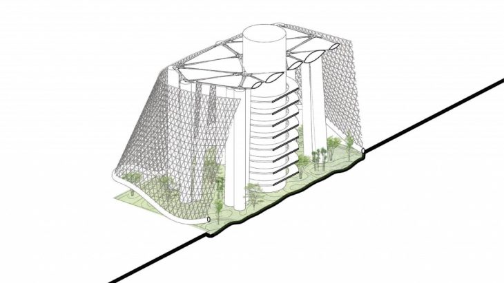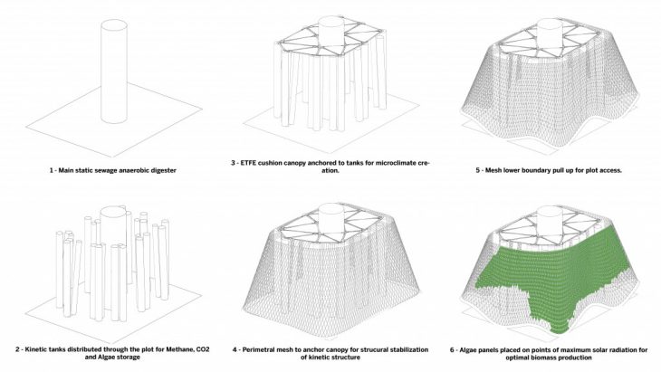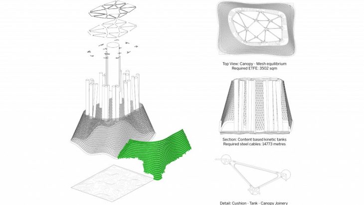The resulting structure is a performative oscillating kinetic envelope in constant tensile equilibrium. A kinetic forest of tanks kept in balance by an inflated ETFE cushion canopy that adjust itself to the oscillations, and a perimetral mesh that ties everything together completing the equilibrium.