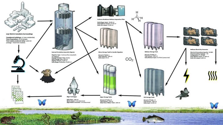 The answer is feces. On a daily basis a human being in the developed world produces 80 litres of sewage, taking into accont the water used for this process. From this starting point is that the system for the biorefinery was developed.